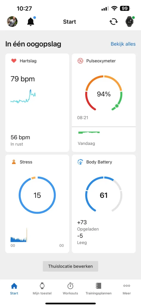 Zo, je horloge is echt een klein wonderding. Het houdt gedurende de hele dag een heleboel stats over je bij. Hoeveel je beweegt, hoe je lijf eraan toe is – you name it. Al die info wordt mooi verzameld in de app, waardoor je een helder beeld krijgt van je ‘body battery’, je herstelstatus, je gemiddelde hartslag en je zuurstofverzadiging. Super handig, want zo weet je op elk moment van de dag hoe je ervoor staat. En als bonus, als je je sportieve maatje aan je telefoon koppelt, zie je ook je telefoonmeldingen op je horloge verschijnen. Vreemd genoeg, komen sommige meldingen niet door, maar ja, je kunt niet alles hebben, toch?